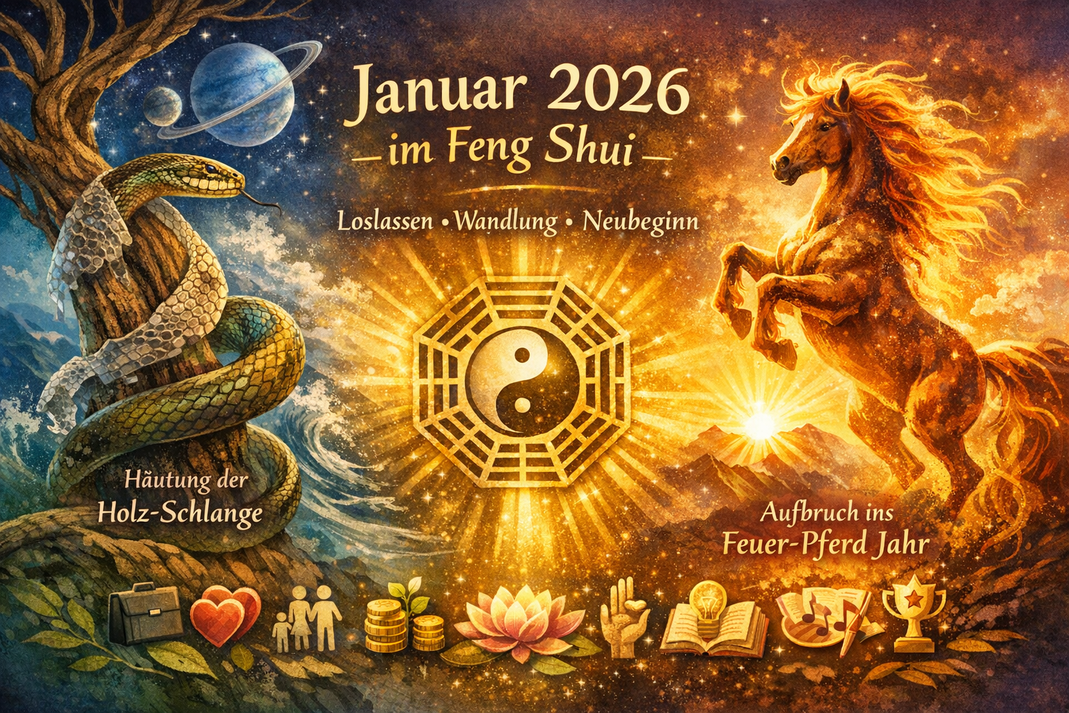 Die Häutung der Schlange – Vorbereitung auf das Feuer-Pferd-Jahr Der Januar 2026 ist aus Sicht des Feng Shui ein ganz besonderer Monat. Er markiert keinen lauten Neubeginn, sondern einen stillen, tiefgreifenden Übergang. Wir befinden uns mitten in der letzten Phase der Holz-Schlange – einer Energie, die für Häutung, innere Reinigung, Bewusstwerdung und Vorbereitung steht. Viele Menschen spüren aktuell eine gewisse Schwere, Müdigkeit oder innere Unruhe. Das ist kein Zufall. Energetisch werden wir eingeladen, innezuhalten, zurückzublicken und ehrlich zu prüfen: Was…